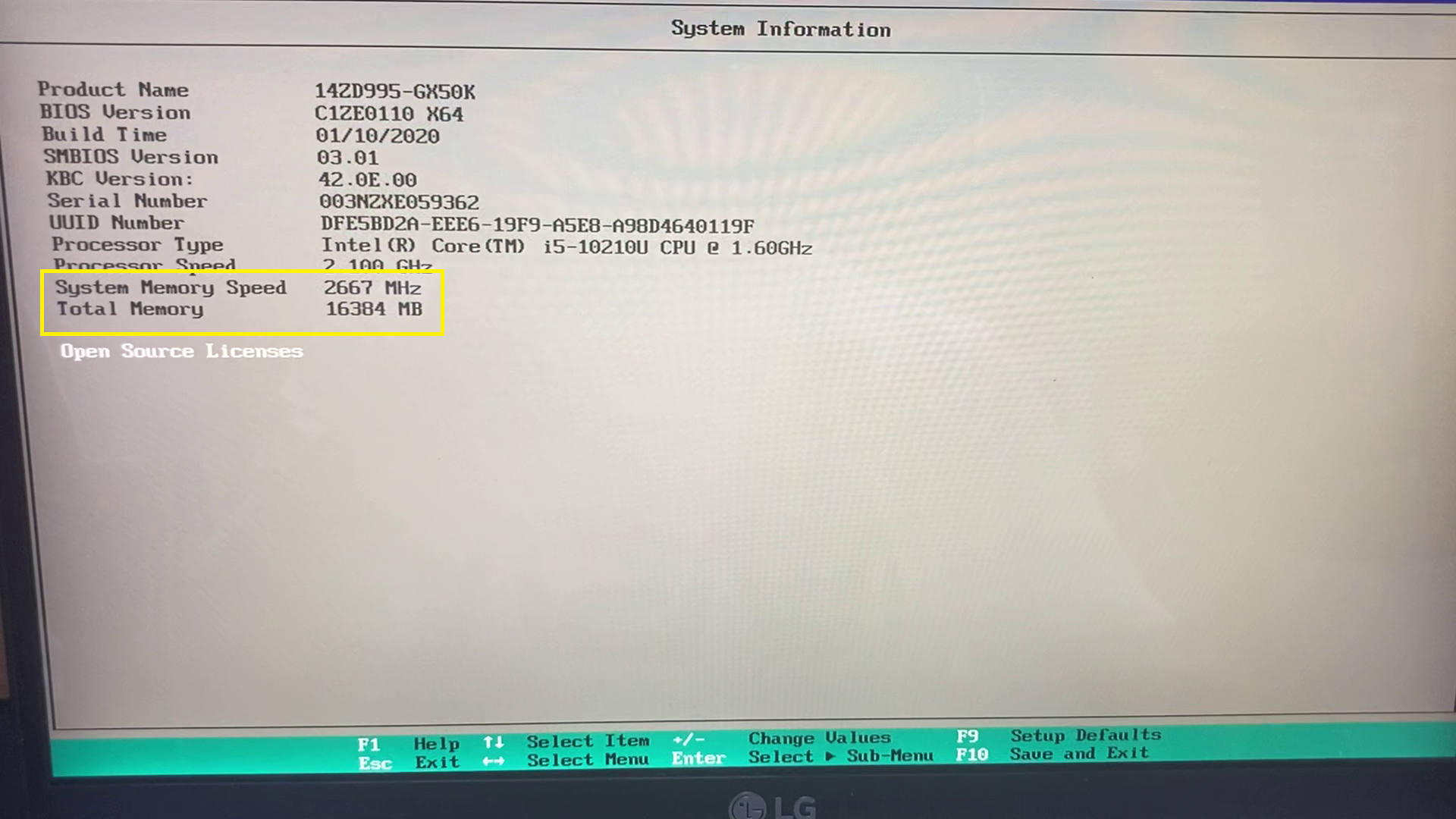 전원을 켜고 F2키를 눌러 CMOS 바이오스 화면으로 들어가 램과 SSD 추가를 확인