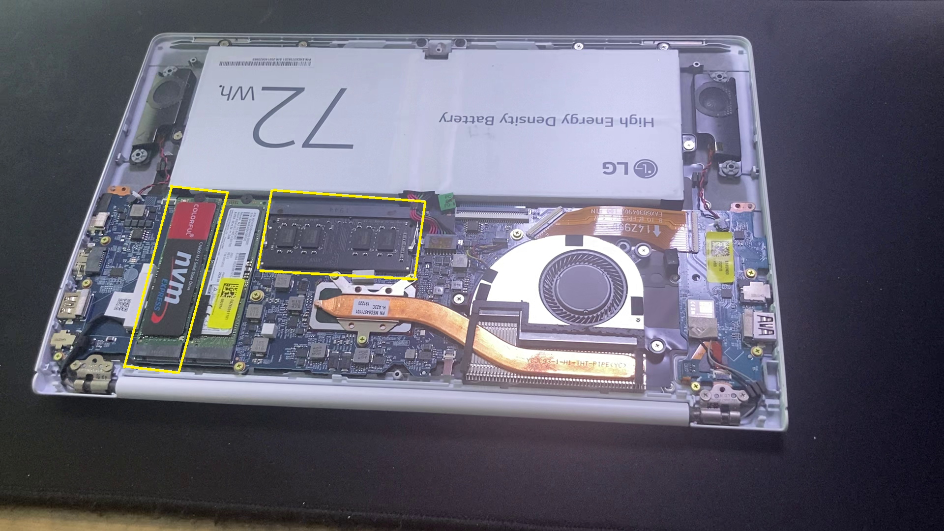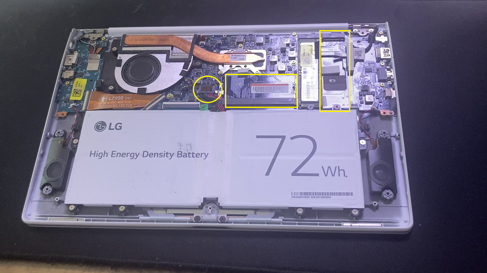 왼쪽부터 배터리 연결 커넥터, 램 DDR4 추가 슬롯, M.2 SSD 추가 슬롯