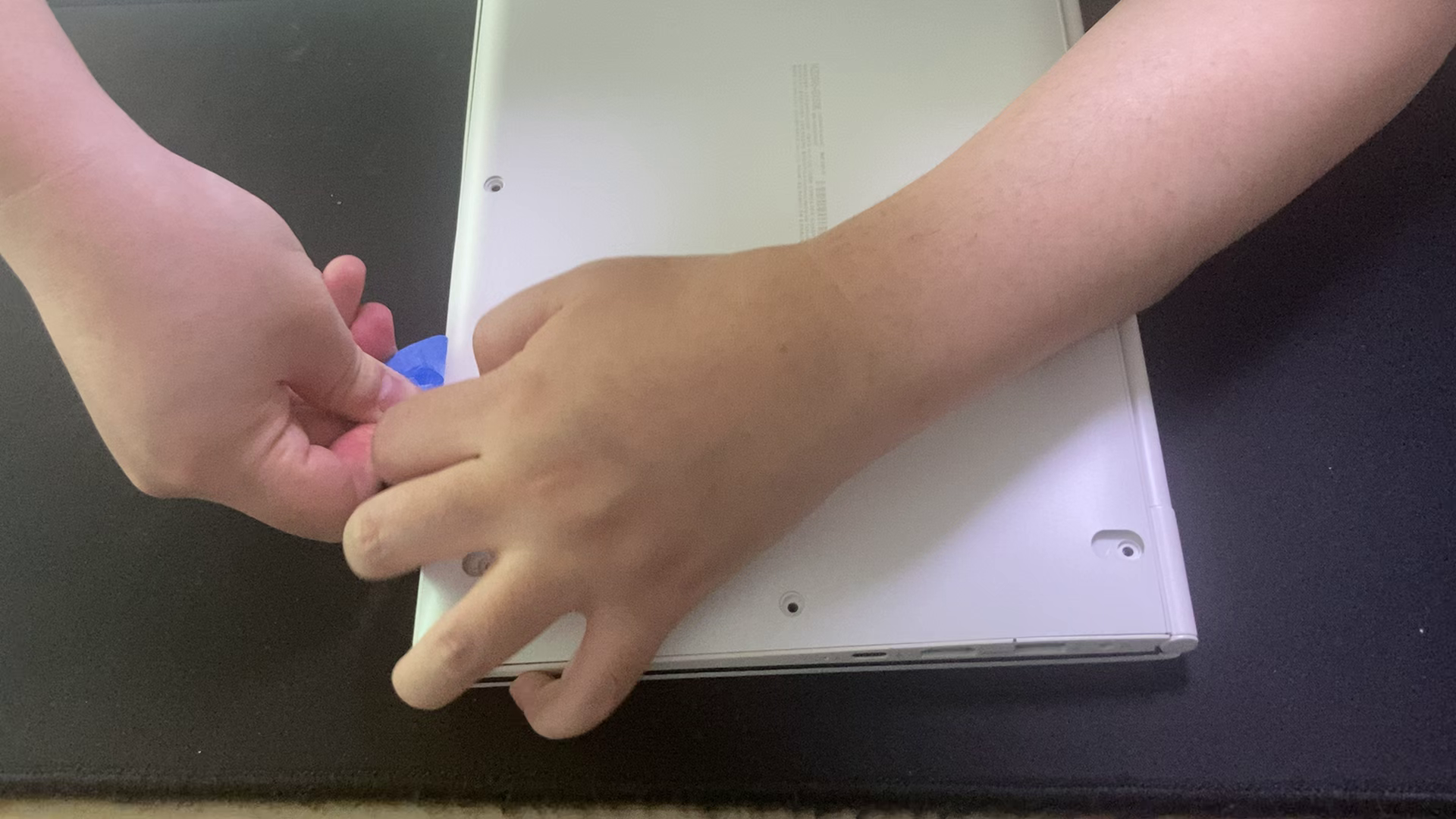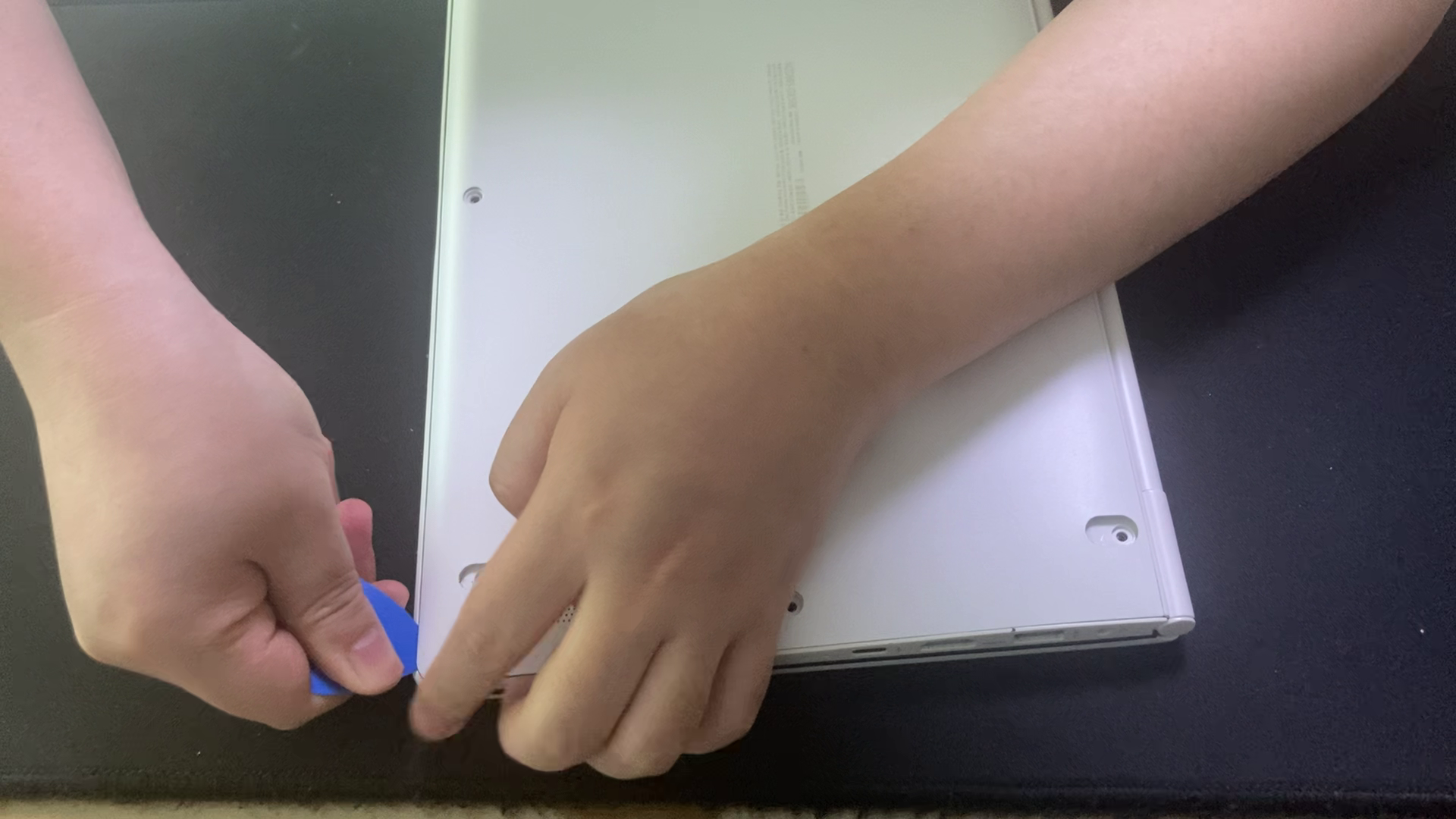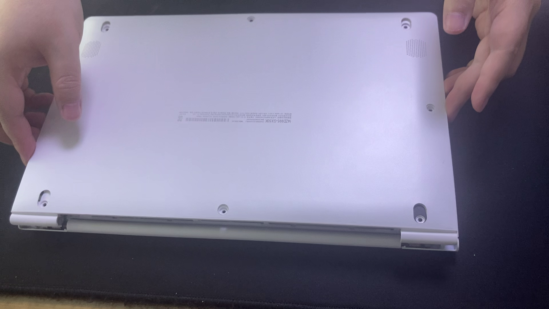 노트북 하판에 있는 고무받침(패드)과 나사 마개를 제거 후 나사를 풀어줍니다.